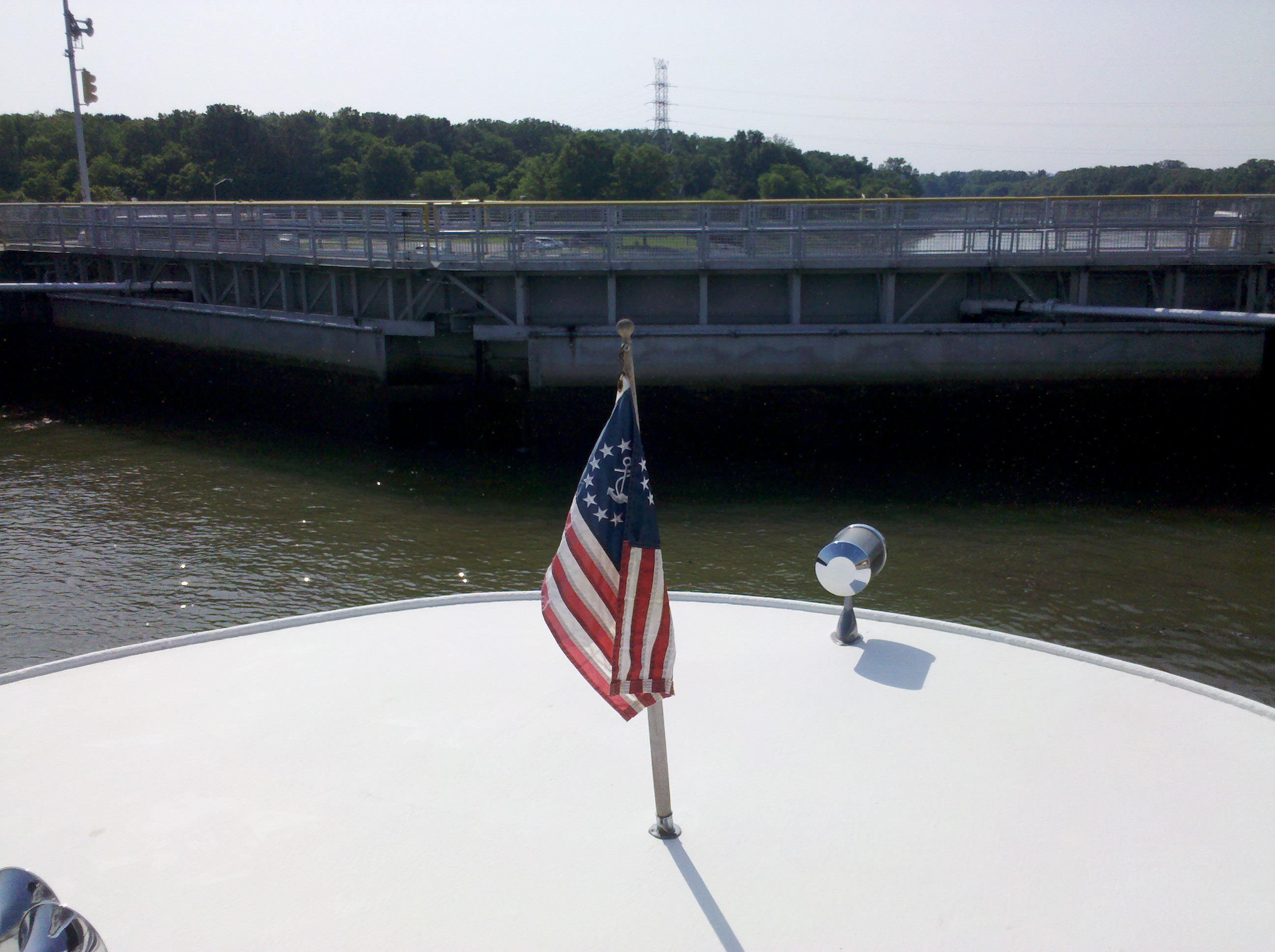 Waiting for the doors to open so we can be lowered into the river channel to downtown.