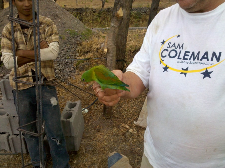 A parakeet flew down from the tree to visit. No, it didn’t come from K-Mart.